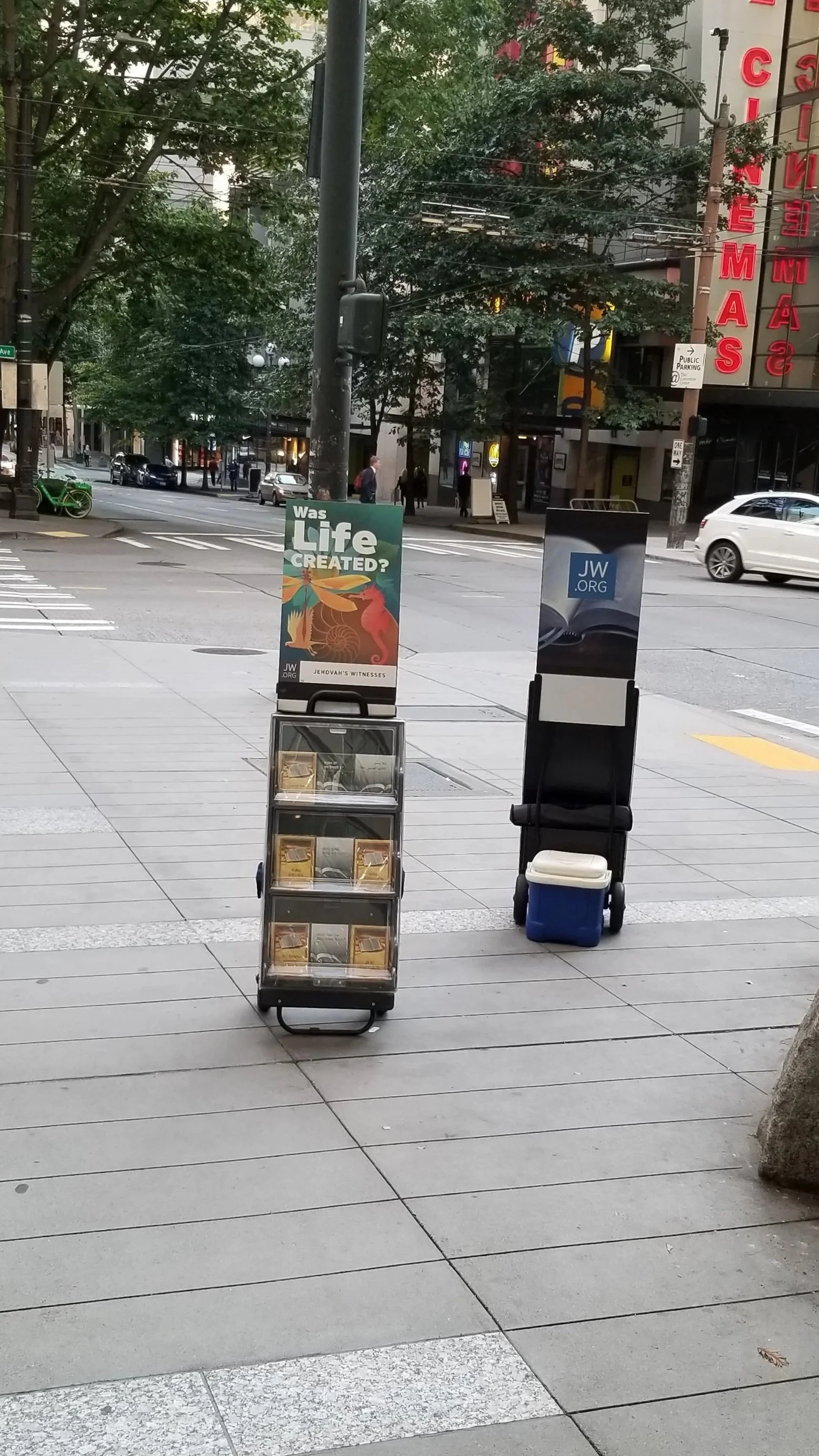 Jehovah's Witnesses set up attractive displays or carts stocked with literature, such as magazines, books, and brochures, in strategic locations.